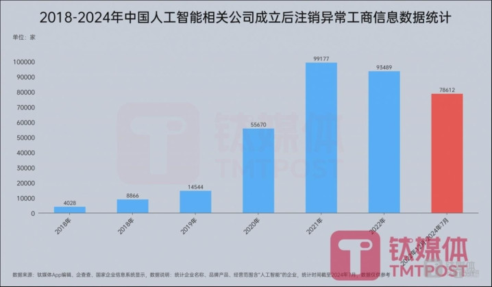 据钛媒体AGI从企查查处统计,自2022年11月底到2024年7月29日,国内新注册成立后现在却处于注销吊销或停业异常状态的AI相关公司数量达78612家,接近8万家企业,占同期新注册87.8万家企业总量的8.9%。